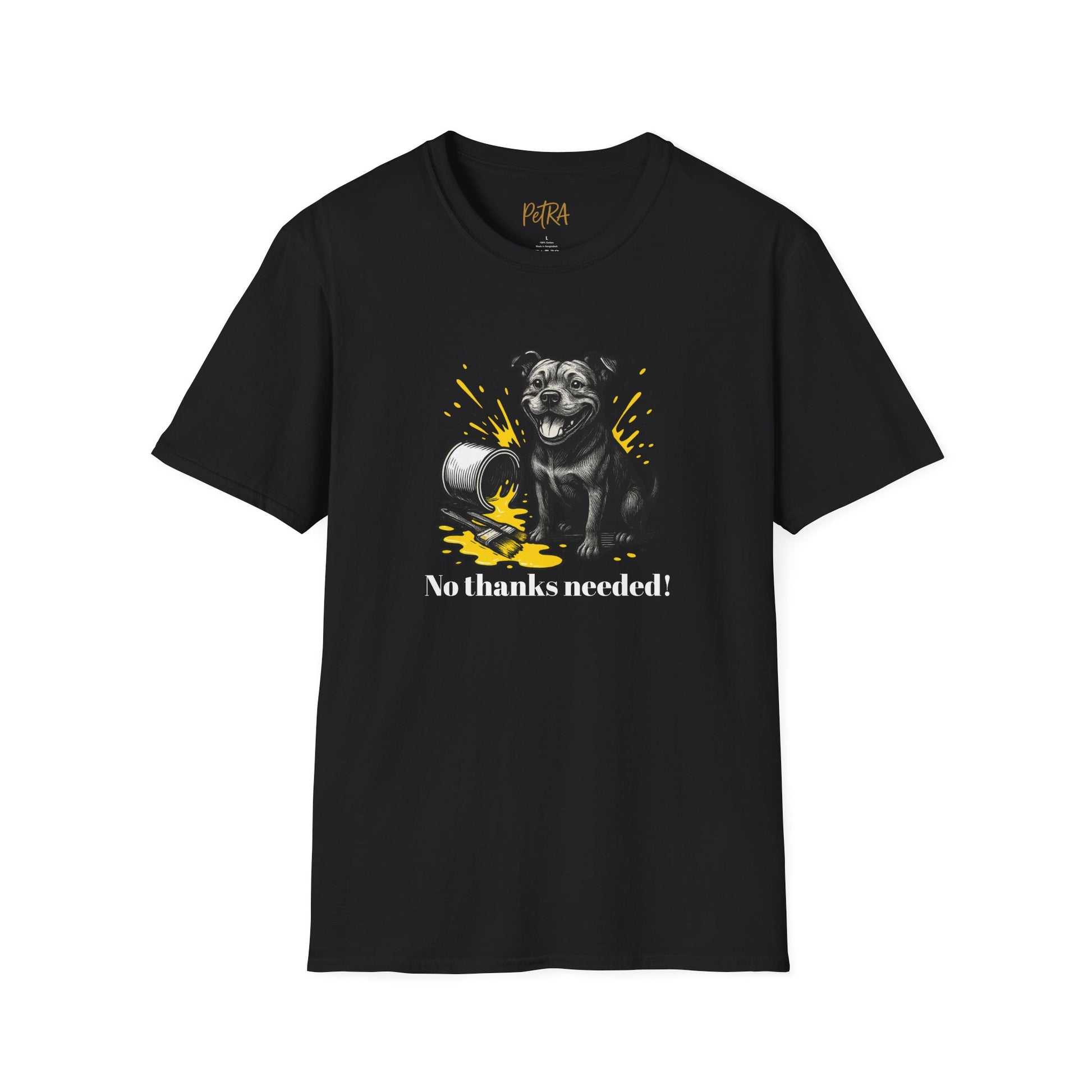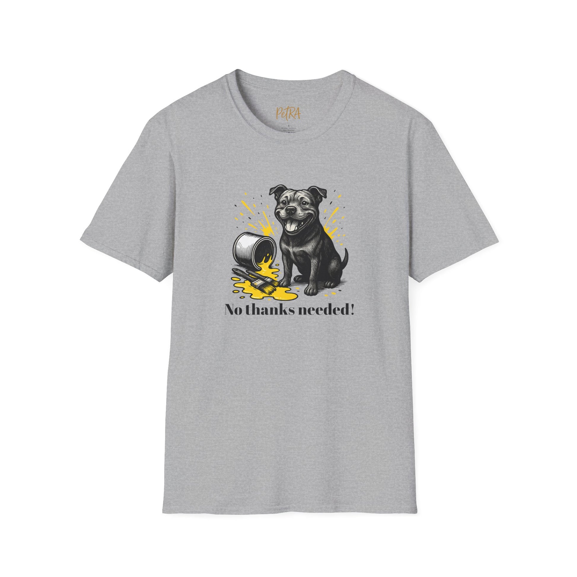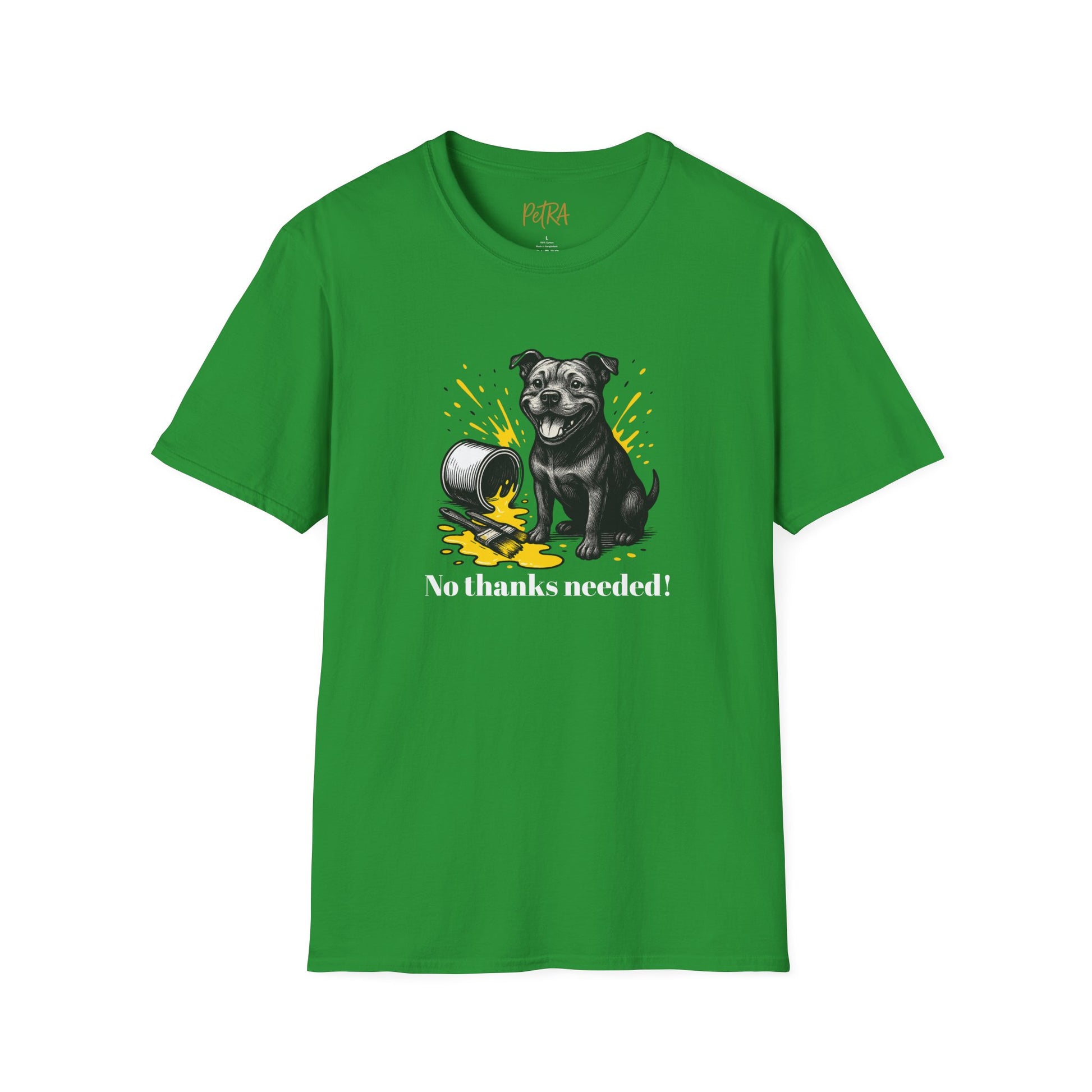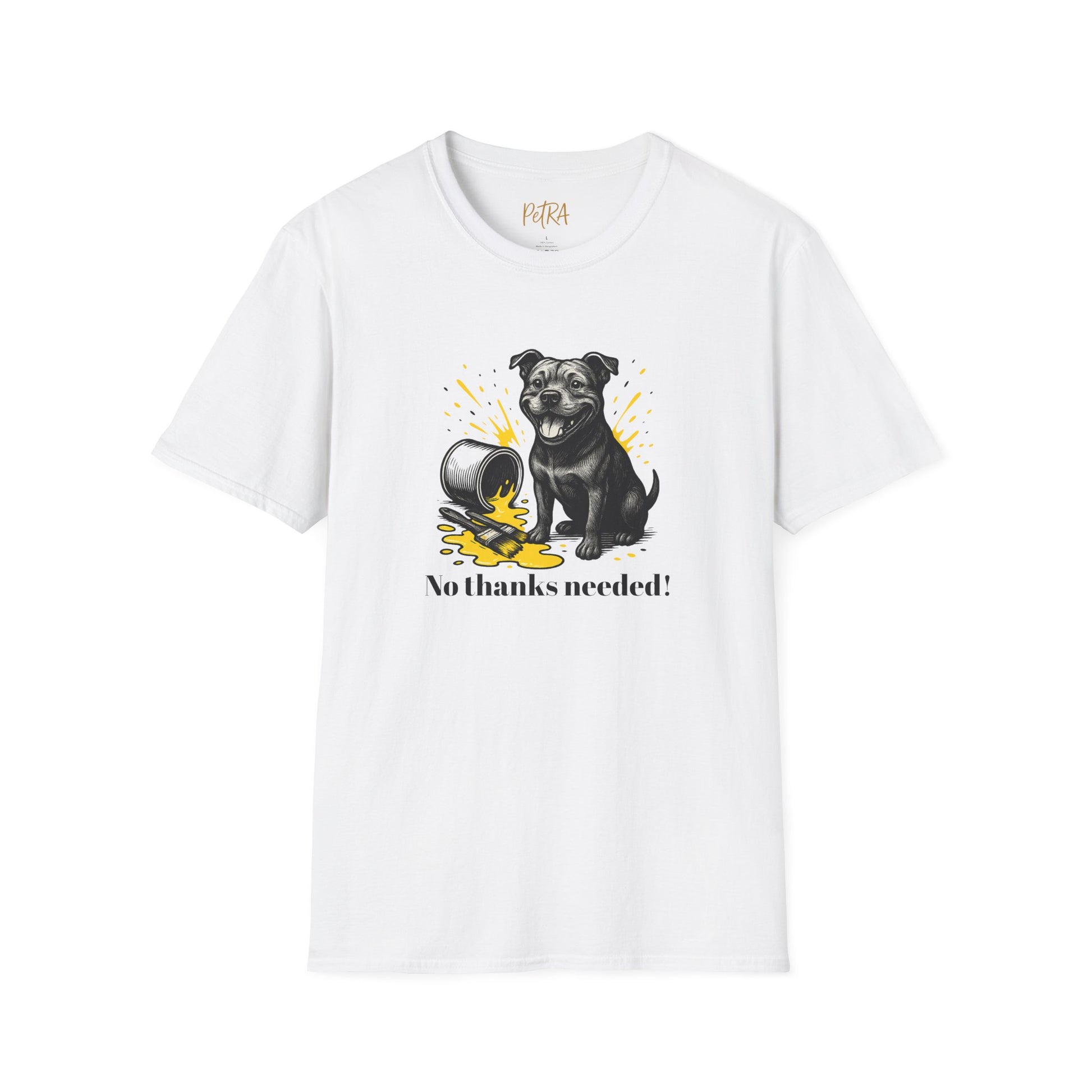Staffy T Shirt – 'No Thanks Needed' Spilled Paint Design – Unisex Fit